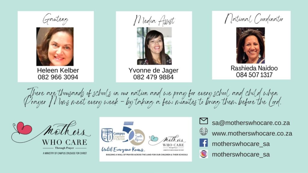 CONTACTS If you would like to start a Prayer Group in your school. You may WhatsApp a regional coordinator or Rashieda [national coordinator]. Arrange a time to call and we will help you get started. We are keen to serve you! CAMPUS CRUSADE FOR CHRIST SA www.cccsa.org.za FB LINK https://www.facebook.com/groups/3285197604876379